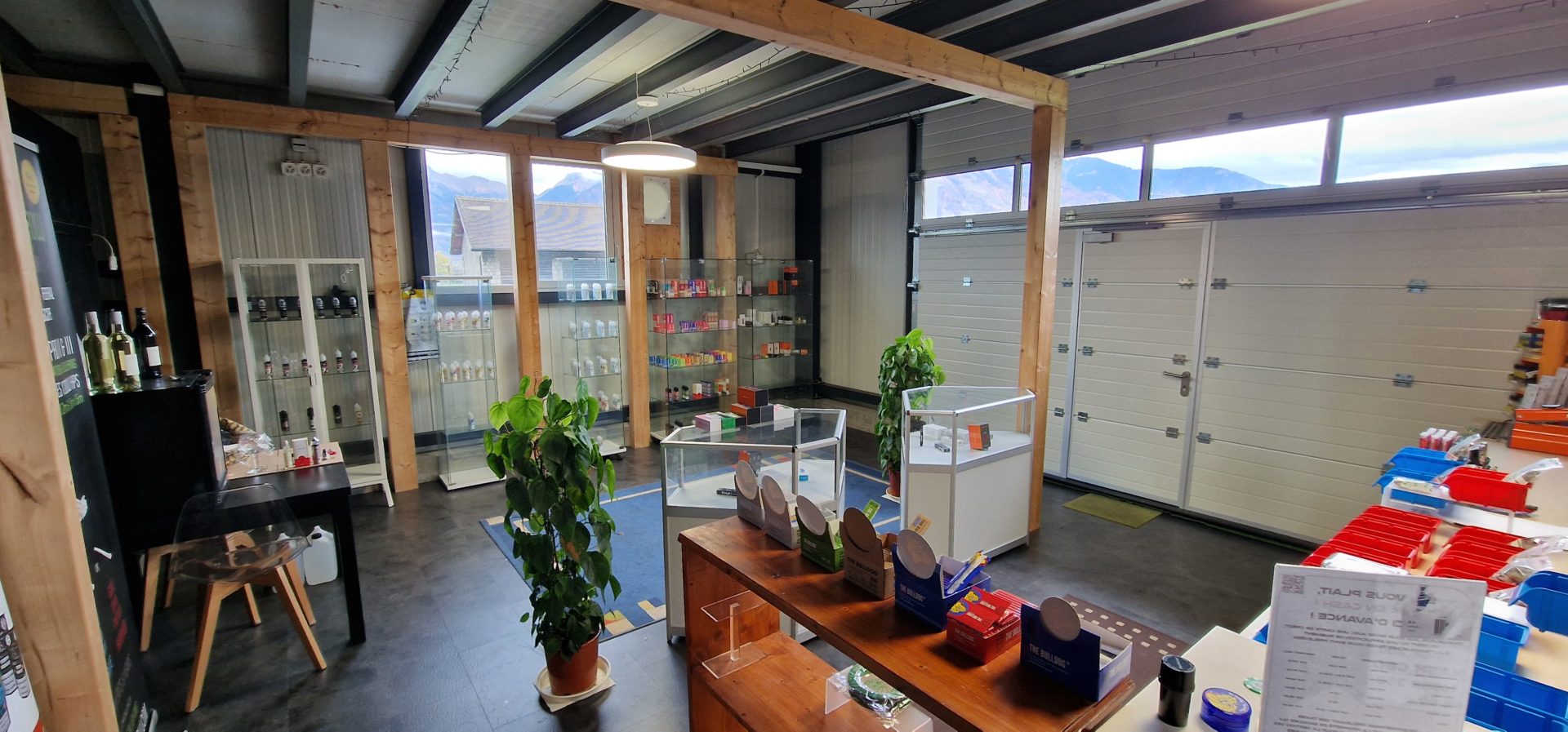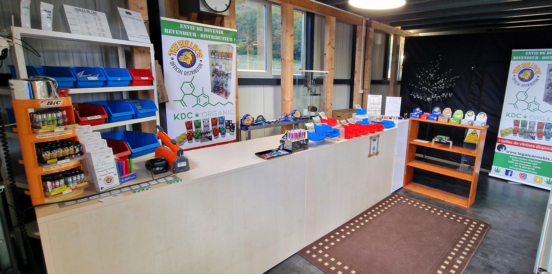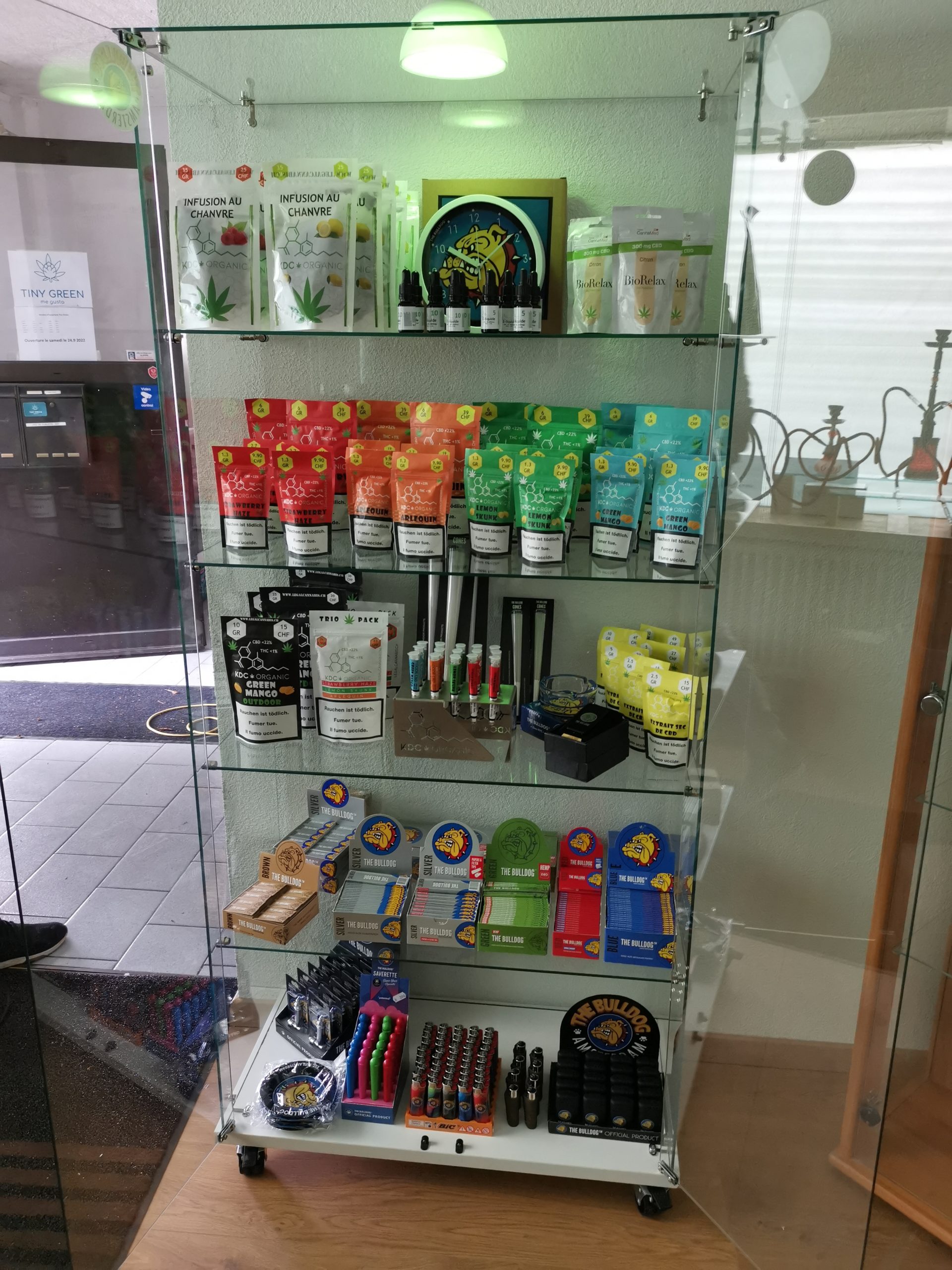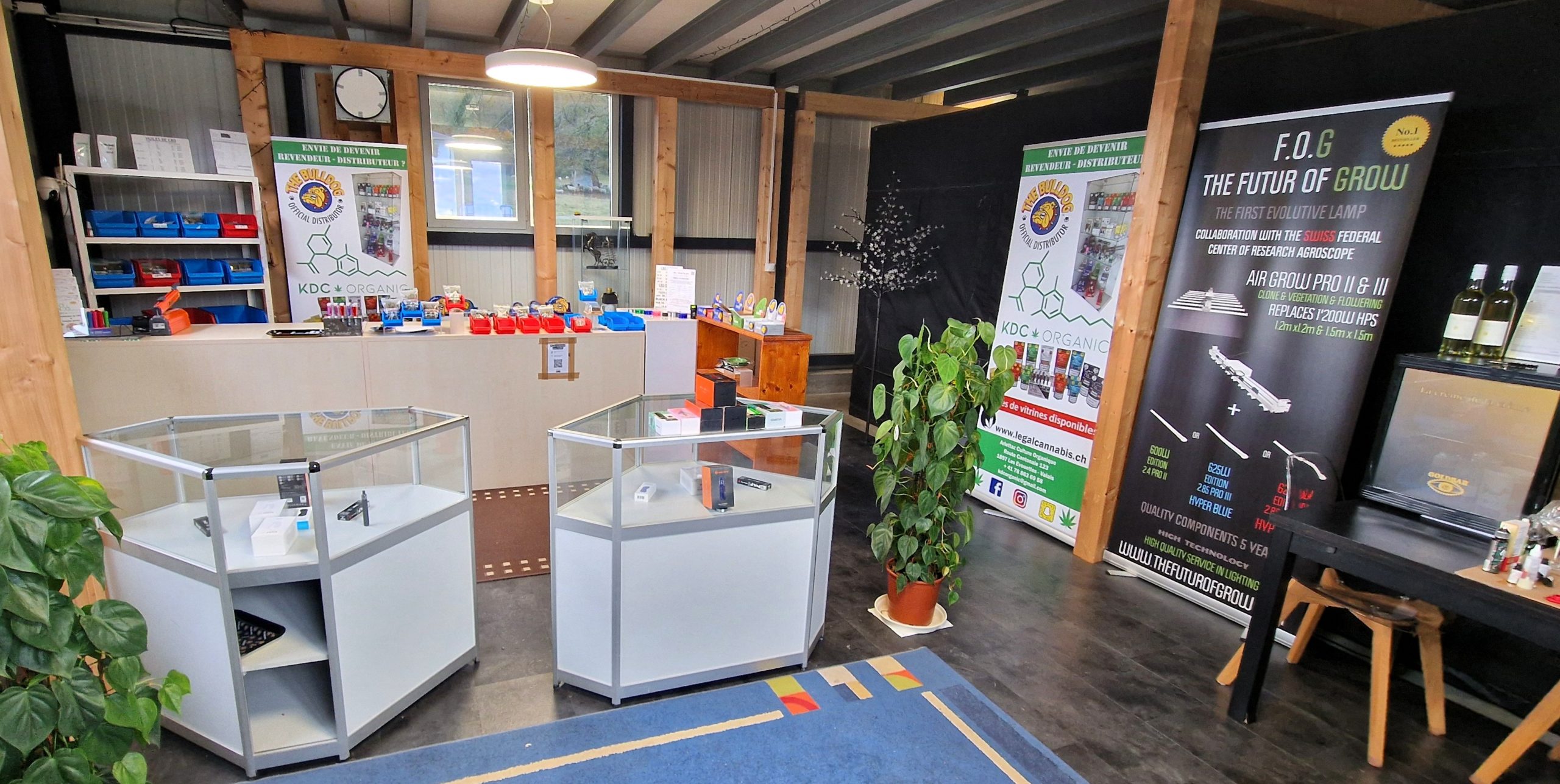 Fleurs, huiles, accessoires The Bulldog et vins suisses sélectionnés.