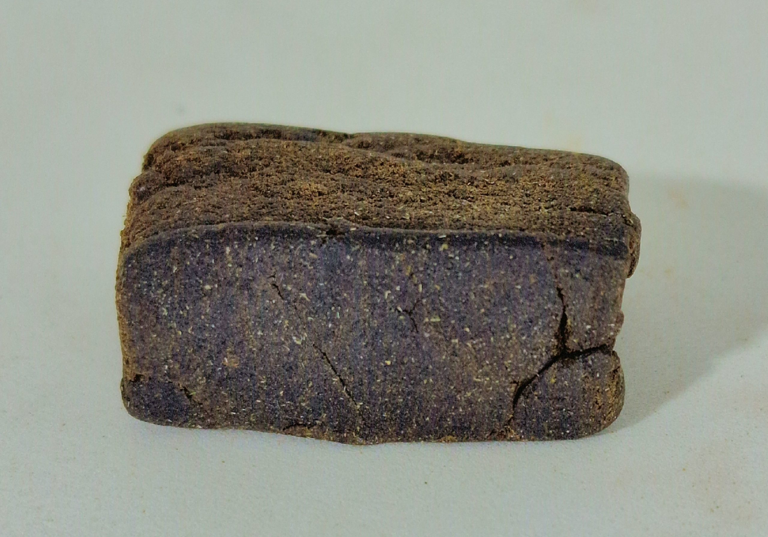 La résine est extérieurement noire, sombre, avec à l’intérieur des teintes plus brunes ou caramel lorsqu’on la casse.