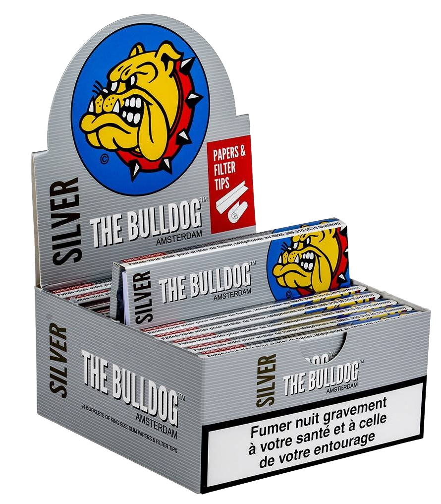 Les feuilles Slim Silver avec filtres The Bulldog Amsterdam sont proposées en format King Size Slim (≈ 109 × 44 mm) avec gomme arabique naturelle et une finesse facilitant une combustion lente et homogène.